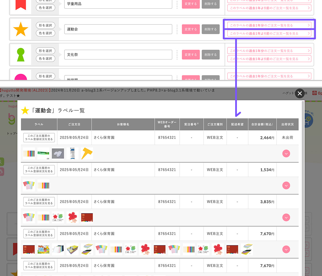 「このラベルの過去1年分のご注文一覧を見る」または「このラベルの過去1年より前のご注文一覧を見る」ボタンを押すと、該当のラベルが付与されているご注文履歴一覧を表示します。