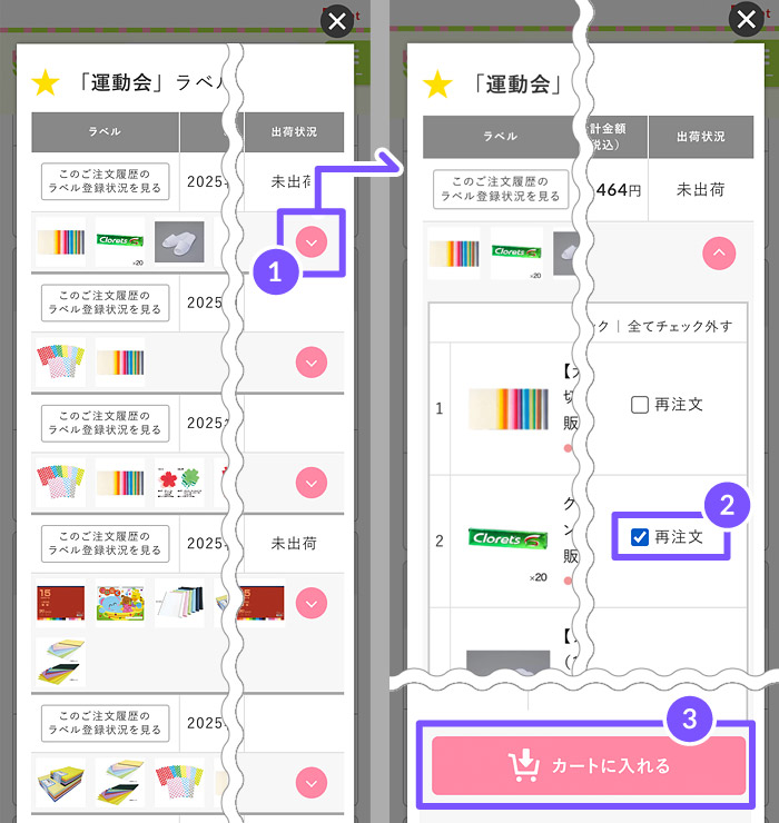 リスト右側のピンクのボタンを押して商品詳細リストを表示し、ご希望の商品の「再注文」にチェックを入れて、「カートに入れる」ボタンを押して商品をカートに追加します。