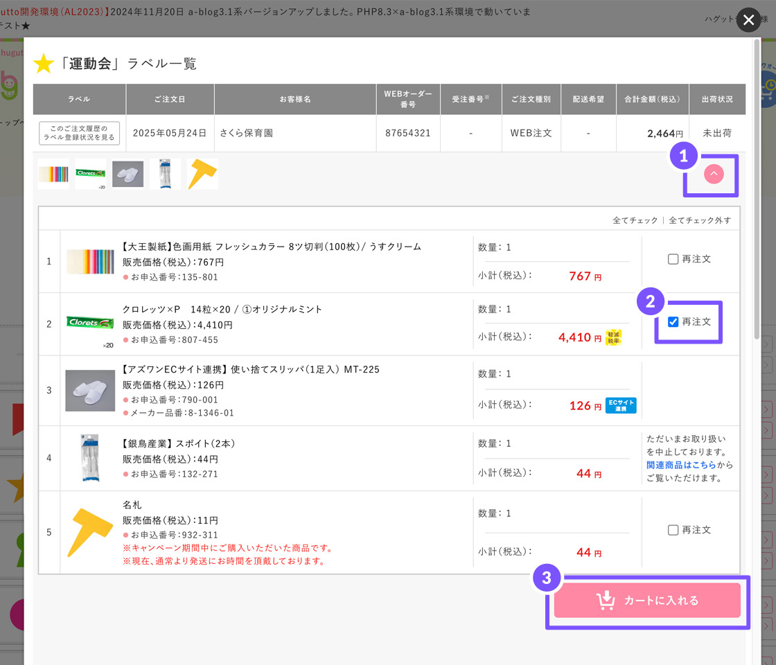 また、ラベルが付与されているご注文履歴から商品をカートに入れることができます。