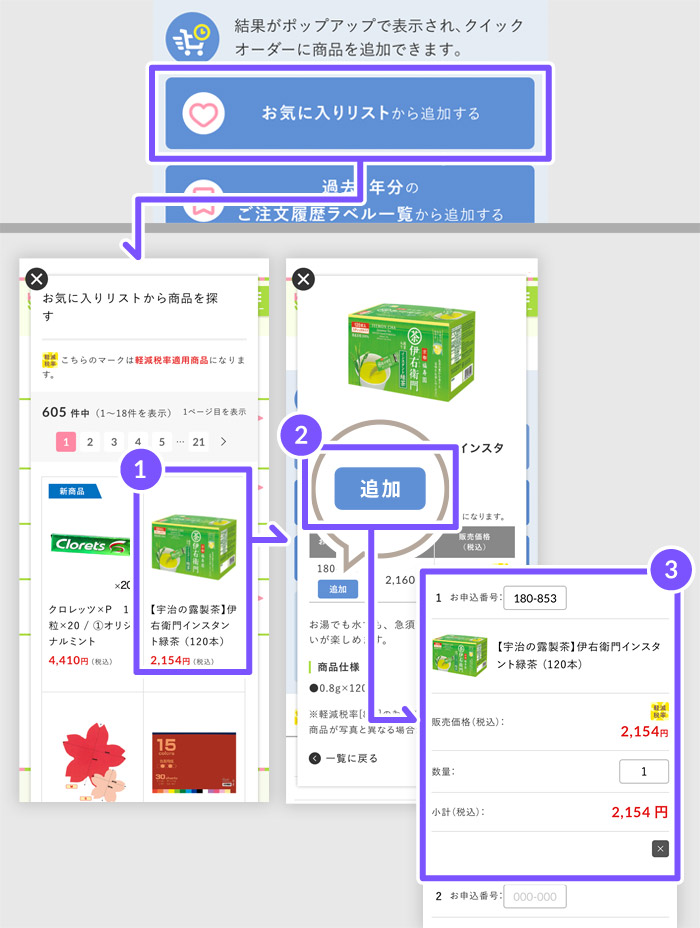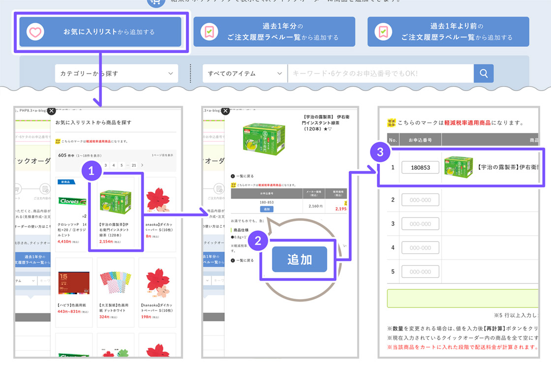 お気に入りリストの一覧から商品を選択し、直接クイックオーダに追加することができます。