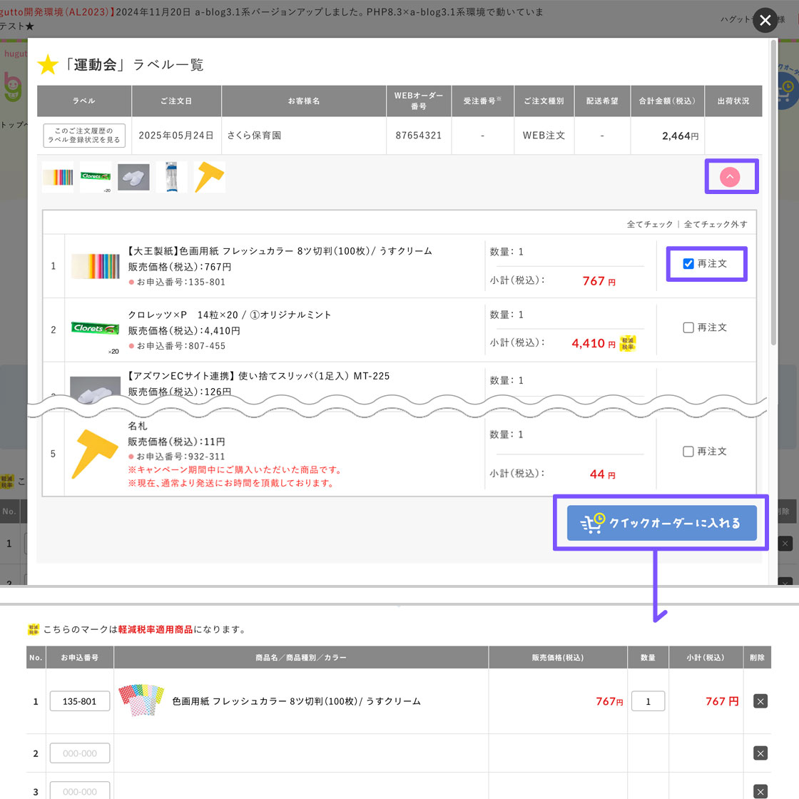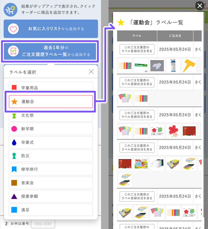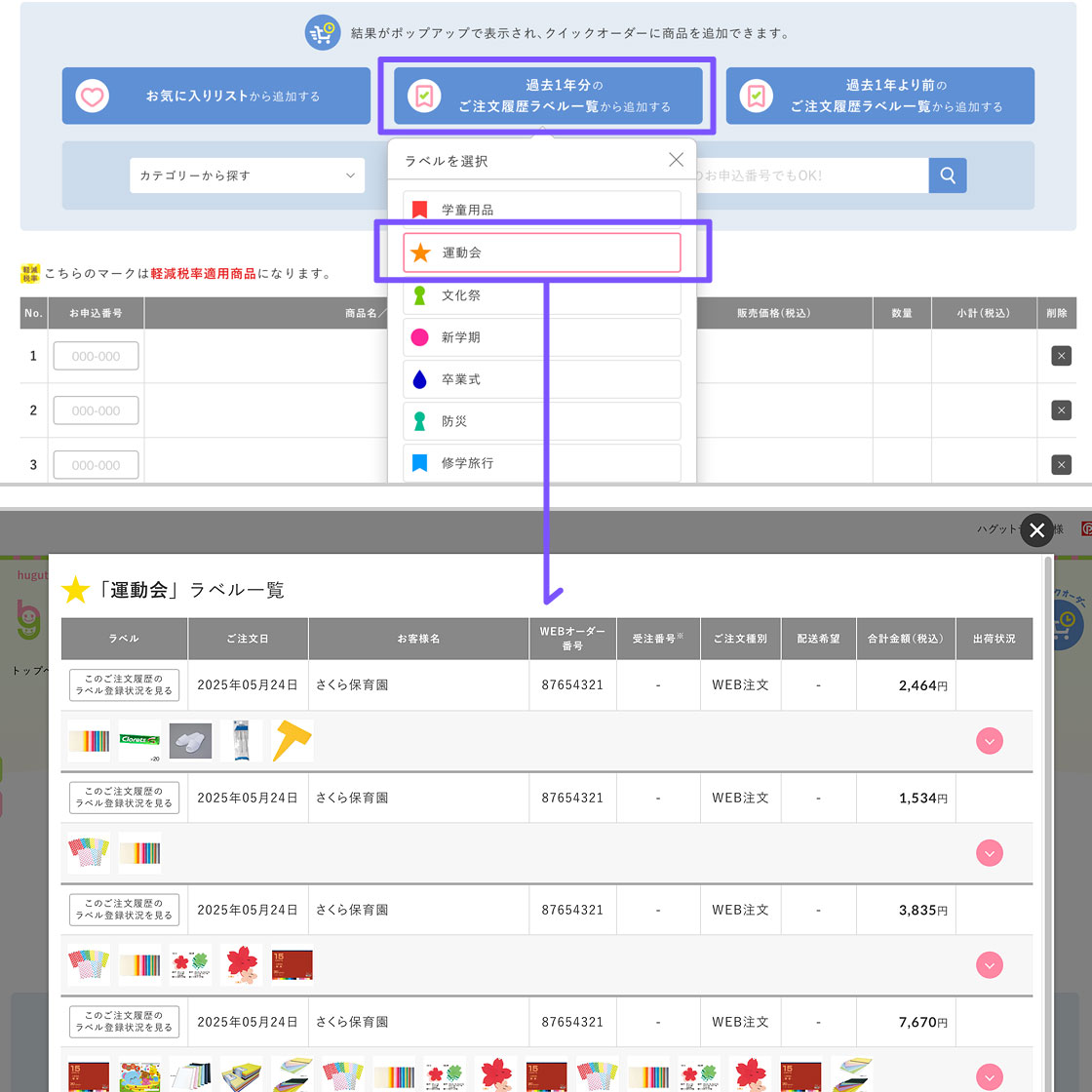 過去1年分または過去1年より前のご注文履歴ラベル一覧から商品を選択し、直接クイックオーダに追加することができます。