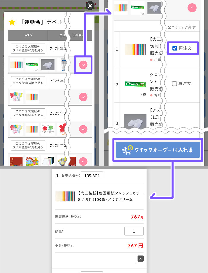 リスト右側のピンクのボタンを押して商品詳細リストを表示し、ご希望の商品の「再注文」にチェックを入れて、「クイックオーダーに入れる」ボタンを押して商品をクイックオーダーに追加します。