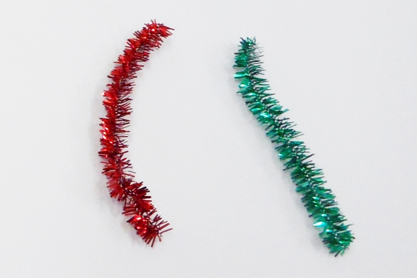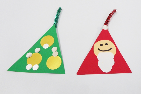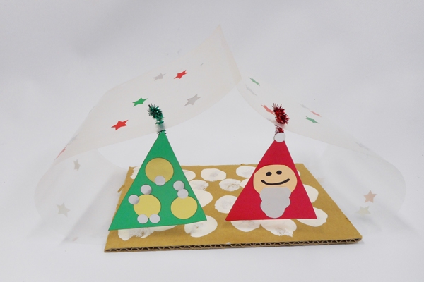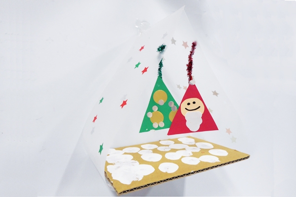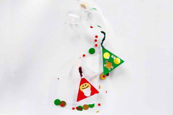 ドーム状にしたクリア素材に穴あけパンチで穴をあけ、サンタクロースとツリーの飾りをつける。