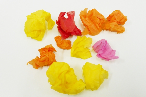 お花紙の色を選び、丸めたり、ちぎったりする。