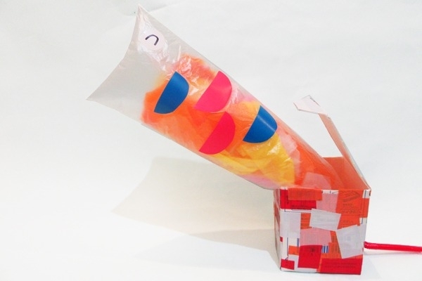 こいのぼりのストロー部分を、牛乳パックの内側から切り込みに差し込んで組み合わせる。