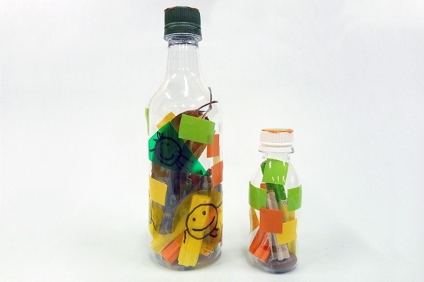 ペットボトルにどんぐりや小枝などの自然物、筒状にしたカラーダンボールシートを入れる。