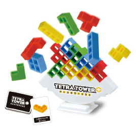 カードの出た目のブロックを崩れないようにグラグラする台座に積み上げるスリリングなゲームです。