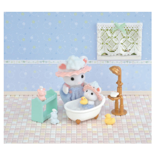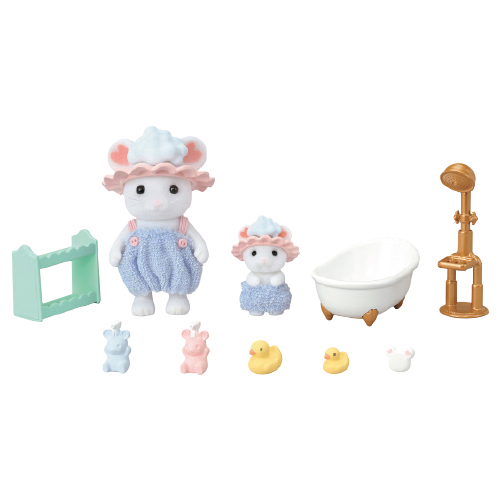 なかよしのバスタイムが楽しめる、マシュマロネズミの男の子と小さい赤ちゃん、おふろ小物のセット。