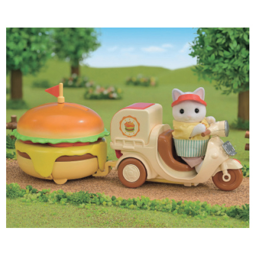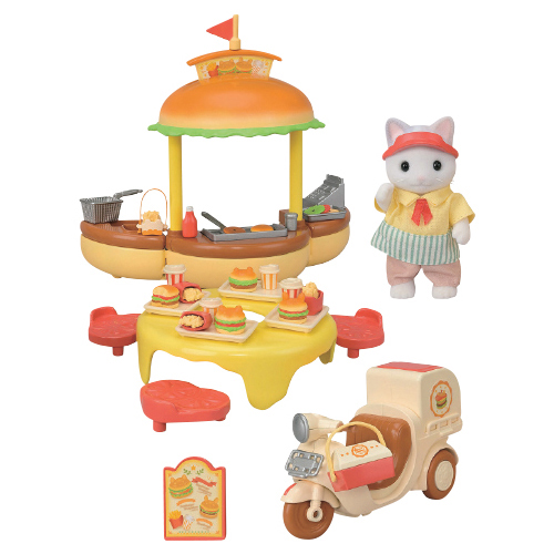 ハンバーガーのかたちをしたお店とデリバリーバイク、お人形のセット。