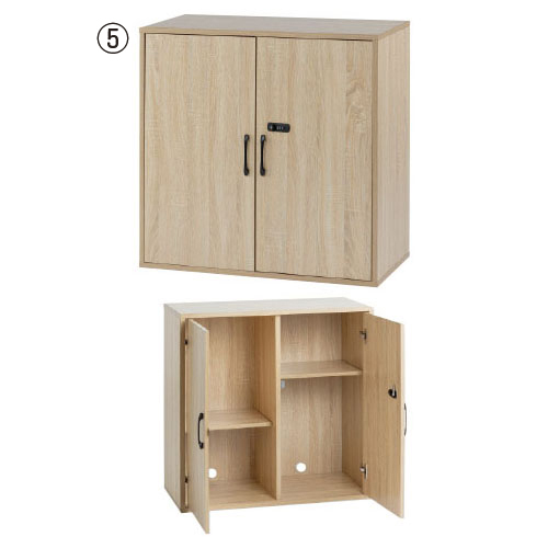 ●付属品/専用工具、穴隠しシール、連結ボルト、ナット、ワッシャー、木ダボ、鍵:(1)(4)(5)2本、棚板:(1)(2)(4)1枚(3)(5)2枚