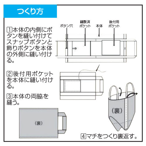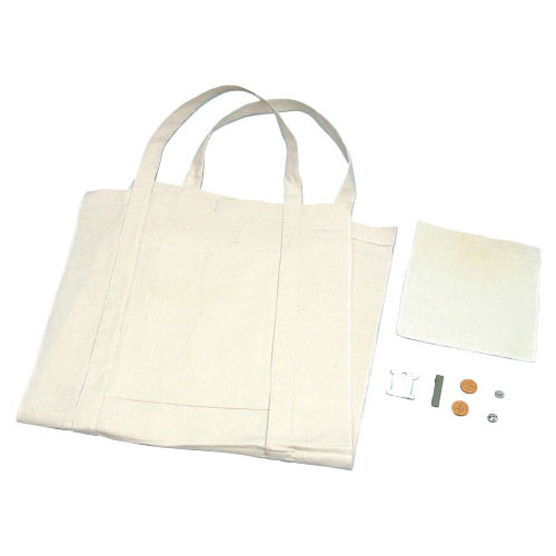 ●内容/帆布バッグ本体[2辺ロックミシン加工済](400×830㎜)×1、ポケット[3辺ロックミシン加工済](225×270㎜)×1、四つ穴ボタン(φ20㎜)×2、スナップボタン(φ12㎜)×1、縫い針(φ1×45㎜)×1、縫い糸(5m)×1●完成サイズ/390×400㎜●材質/帆布