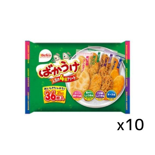 レギュラーのばかうけ青のり・ごま揚しょうゆ・中までチーズに、甘口しょうゆと甘口カレーをミックスしたばかうけのアソートです。