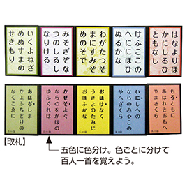 かるたクイーン監修。100枚の札をきまり字別に20枚ずつ5種類に色分け!ちょっとした休み時間に遊べます!
