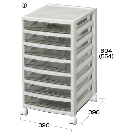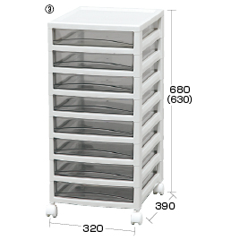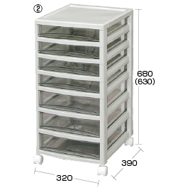共通仕様・浅引出し内寸:W260×D360×H55mm・中引出し内寸:W260×D360×H77mm●材質/天板・フレーム:ポリプロピレン、引出し:スチロール●付属品/キャスター:4個(ストッパー無)●重量/(1)4kg(2)4.3kg(3)4.5kg(4)6.5kg