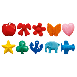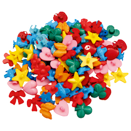 ●内容/100個(リンゴ、リボン、花、チョウ、ハート、星、クローバー、イカリ、ゾウ、飛行機:各10個)●サイズ/約φ18×9㎜●材質/ナイロン