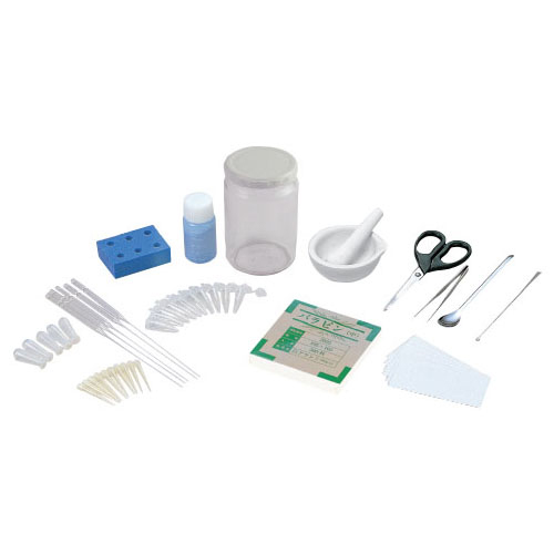 ●内容/乳鉢、はさみ、シリカゲル粉末40g、薬さじ、薬包紙、マイクロチューブ(色素抽出用容器、容量1.5ml)10本、ミクロスパーテル(色素抽出用)、マイクロチューブ立て、チップ(毛細管、試料滴下用)10本、薄層プレート(100×50㎜)5枚、展開槽、ピンセット、パスツールピペット5本(専用キャップ付き)