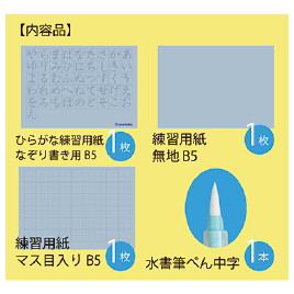 ●内容/筆ぺん中字1本、ひらがな練習用紙なぞり書き用1枚、練習用紙マス目入1枚、練習用紙無地1枚、チャック袋●サイズ/パッケージ:190×300×15㎜●重量/70g●材質/ぺん:PP、PE、PEs、水書用紙:紙・顔料、チャック袋:PE、個袋:PP、台紙:ボール紙