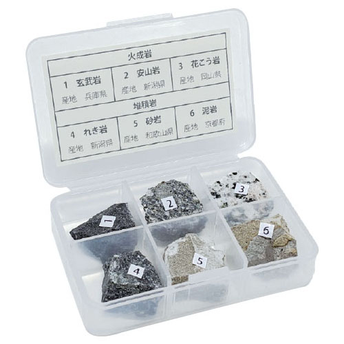 ●内容/火成岩(花崗岩・安山岩・玄武岩)、堆積岩(礫岩・砂岩・泥岩)●サイズ/標本:不定形、ケース:87×60×20㎜