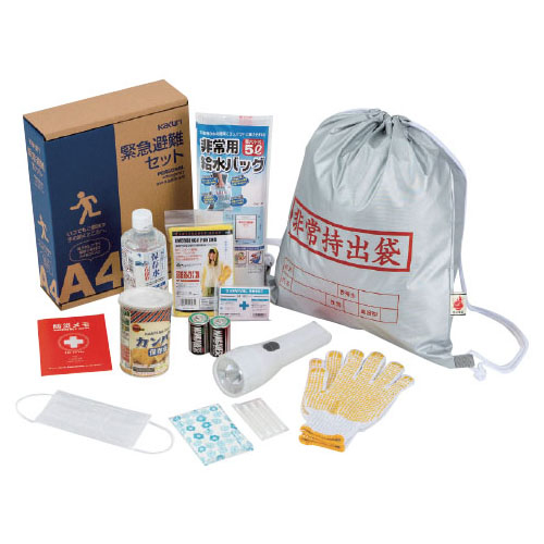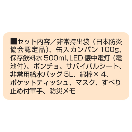 ●サイズ/外装:240×310×85㎜●重量/約1.4kg■セット内容/非常持出袋(日本防炎協会認定品)、5年保存缶入カンパン100g、7年保存飲料水500ml、LED懐中電灯(電池付)、ポンチョ、サバイバルシート、非常用給水バッグ5L、綿棒× 4、ポケットティッシュ、マスク、すべり止め付軍手、防災メモ
