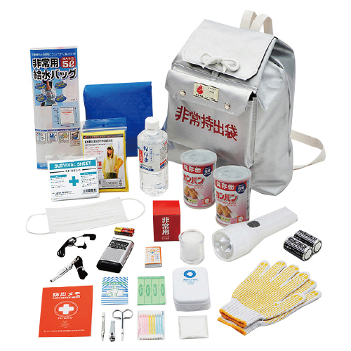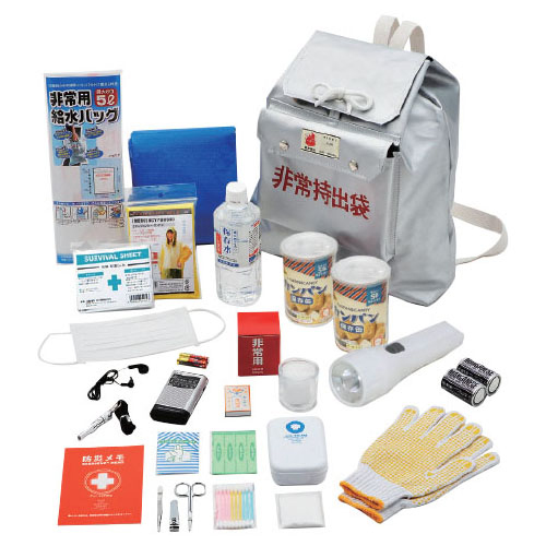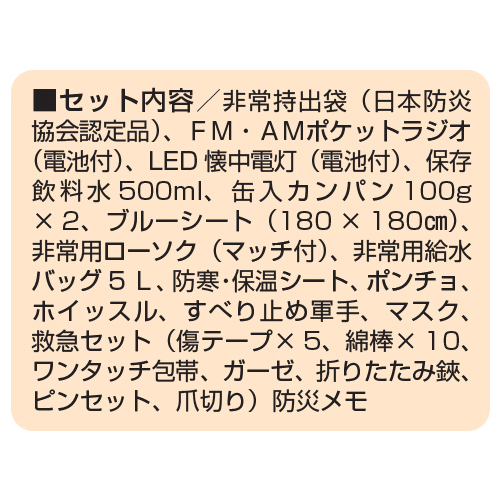 ●重量/約2.9kg■セット内容/非常持出袋(日本防炎協会認定品)、FM・AMポケットラジオ(電池付)、LED 懐中電灯(電池付)、7年保存飲料水500ml、5年保存缶入カンパン100g×2、ブルーシート(180×180㎝)、非常用ローソク(マッチ付)、非常用給水バッグ5L、防寒・保温シート、ポンチョ、ホイッスル、すべり止め軍手、マスク、救急セット(傷テープ×5、綿棒×10、ワンタッチ包帯、ガーゼ、折りたたみ鋏、ピンセット、爪切り)防災メモ