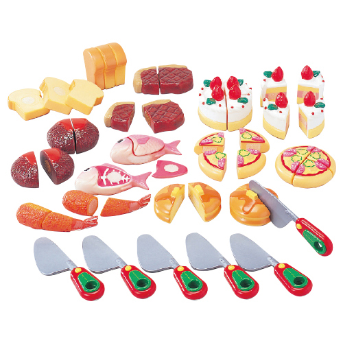 ●内容/ショートケーキ、ピザ、ホットケーキ、ステーキ、ハンバーグ、たい、食パン、エビフライ×各2、包丁×6●サイズ例/ピザ:8×8×2㎝、たい:10.5×5.5×3㎝、包丁:14×4㎝●重量/約750g●材質/非フタル酸系PVC、ABS樹脂、ポリスチレン