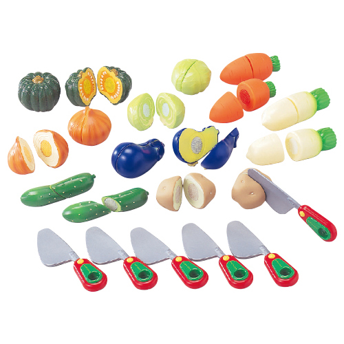 ●内容/にんじん、なす、だいこん、じゃがいも、かぼちゃ、たまねぎ、キャベツ、きゅうり×各2、包丁×6●サイズ例/なす:5×5×8.5㎝、たまねぎ:6×6×5㎝●重量/約600g●材質/非フタル酸系PVC、ABS樹脂、ポリスチレン
