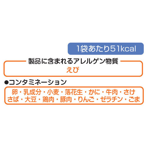 ●原材料/馬鈴薯澱粉(馬鈴薯(北海道))、植物油(パーム油、なたね油)、アカエビ、食塩、アキアミ、砂糖、あおさ、えびエキス、いかエキス、昆布エキス