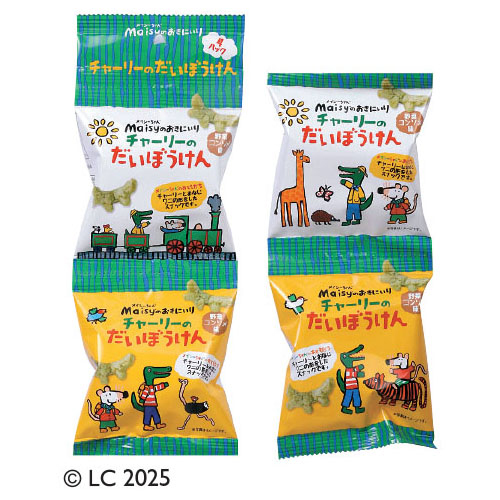 メイシーちゃんのお友達「チャーリー」と同じワニの形をした、サクッとした食感の野菜コンソメ味のスナックです。国内産うるち米、国内産小松菜のパウダー使用。