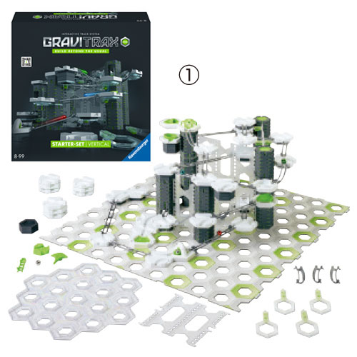 ●内容/(1)ベースプレート×4、透明プレート×1、ボール×6、柱タイル大×20、柱タイル小×9、カーブタイル×28、ジャンクションタイル×4、スイッチ×2、3イン1タイル×1、うずまきタイル×1、発射台タイル×1、マグネットキャノン×1、トラック大×3、トラック中×6、トラック小×9、フィニッシュライン×1、基本タイル×4、キャッチャー×2、フリーフォール×1、スプラッシュ×1、着地台タイル×1、ウォール小×1、ウォール中×2、ウォール大×2、カーブトラック×8、バルコニーシングル×16、バルコニーダブル×4、ピラー(穴あり)×4、ピラー(穴なし)×8(2)ピラー(穴なし)×8、ピラー(穴あり)×4、ウォール中×2、ウォール大×2、バルコニー×16