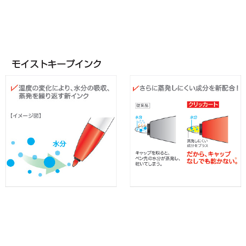 モイストキープインクを採用した、キャップなしでもペン先が乾かず書けるノック式の水性カラーペン