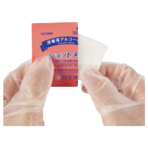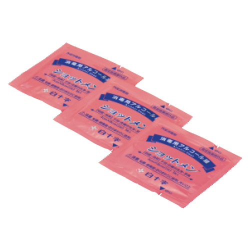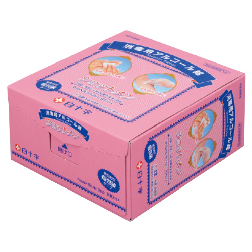 80vol%エタノール含浸綿。手指・皮膚の洗浄や消毒に。