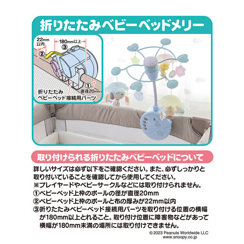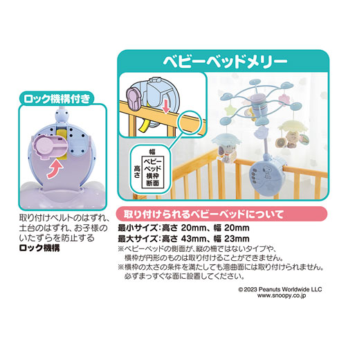 ●内容/音声ユニット、土台、支柱、支柱キャップ、アームA、アームB、飾り(雲、月、ドーナツ、アイス、犬小屋、クッキー)、ぬいぐるみ(スヌーピー、チャーリー・ブラウン、ウッドストック)、飾り成型品(ほし、ことり、お花)、折りたたみベッド接続パーツ×各1、傘×3●サイズ/W42×D42×H56㎝●重量/1370g●電池/単2アルカリ乾電池×3(別売)