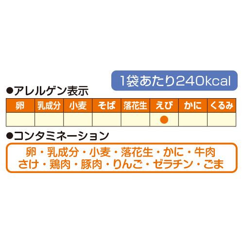 ●原材料/馬鈴薯澱粉(馬鈴薯(国産))、植物油(なたね油、パーム油)、にんじん、ほうれん草、ピーマン、キャベツ、玉ねぎ、食塩、レタス、砂糖、発芽玄米粉、トマト、セロリ、にんにく、醤油、いかエキス、えびエキス、昆布エキス、本みりん、(一部にえび・大豆・いかを含む)