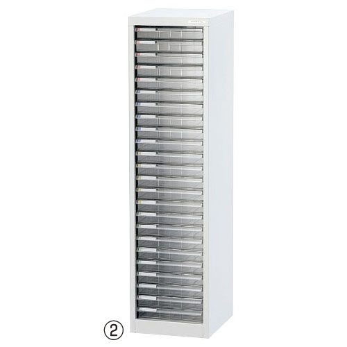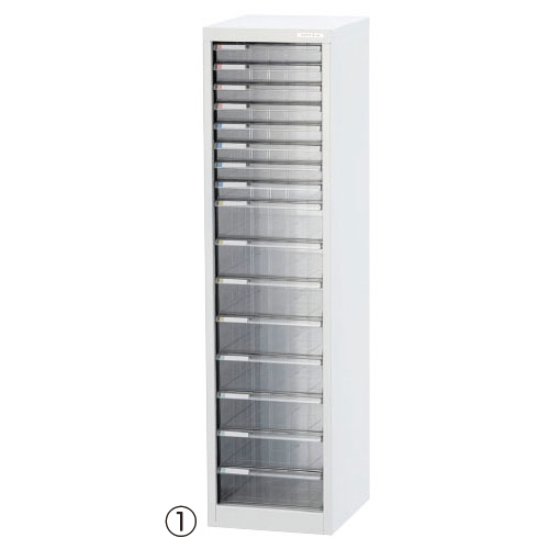 ●サイズ/本体:W277×D336×H1120㎜●重量/(1)14.2㎏(2)15.3㎏共通仕様・浅引出し内寸:W233×D307×H36㎜・深引出し内寸:W233×D307×H80㎜・ 材質/本体:スチール、引出し:透明スチロール樹脂・付属品/カラー分類タイトルシール