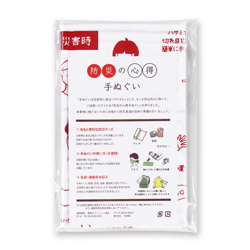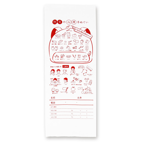 災害時の手ぬぐいの活用方法や連絡先の記入欄がプリントされた災害への備えに特化した防災用手ぬぐいです。