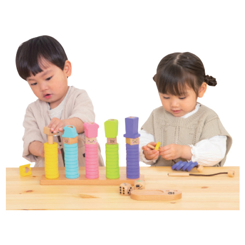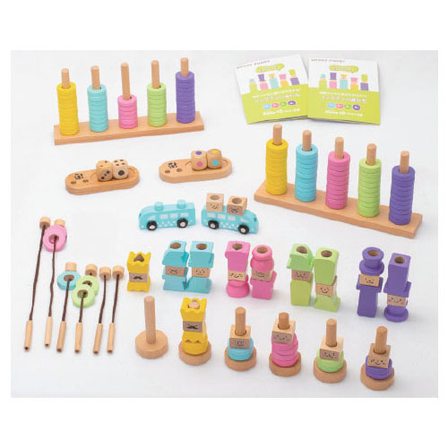 リング型の積み木で棒通し、ひも通し、プルトイ、サイコロ使ってゲームなど40種の遊びが楽しめます。