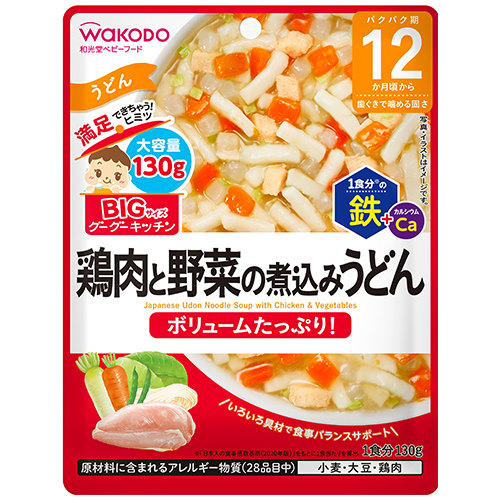 ●原材料/野菜(だいこん(国産)、にんじん、キャベツ、さやいんげんペースト)、うどん(小麦を含む)、鶏肉加工品(鶏肉、オニオンソテー、でん粉、粒状大豆たん白、粉末状大豆たん白)、かつお昆布だし、しょうゆ、砂糖、チキンブイヨン、米酢/増粘剤(加工でん粉)、クエン酸、炭酸カルシウム、ピロリン酸鉄