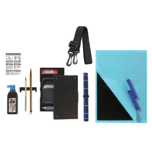 ●内容/太筆、細筆、固形墨、墨液(180ml)、軽量両面硯、ラバーツイン文鎮、下敷、半紙ばさみ、筆巻、スポイト式水差し、書道具収納ケース、筆置き、筆の説明書、ショルダーベルト●サイズ/W255×D70×H310㎜
