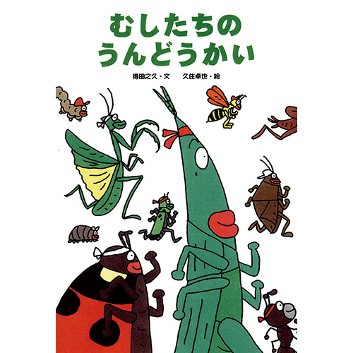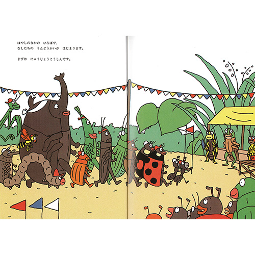 カブトムシ、バッタ、チョウ、ダンゴムシ……たくさんの虫がはらっぱにあつまって、うんどうかいをはじめました!