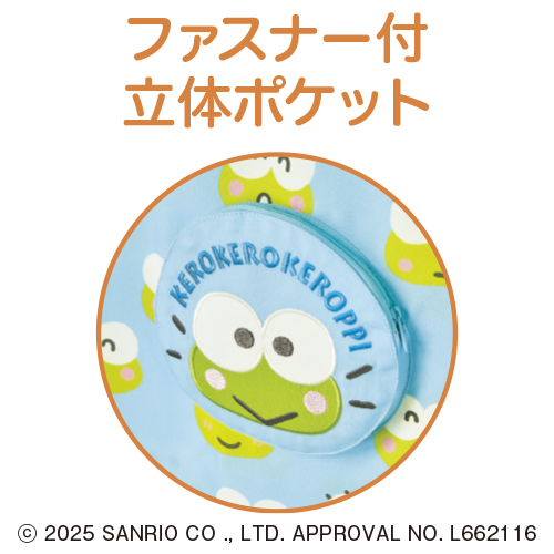 けろけろけろっぴの顔が描かれたファスナーポケットが付いて便利!