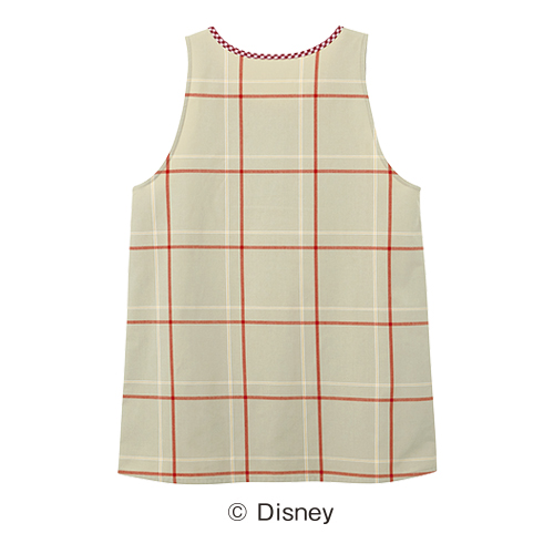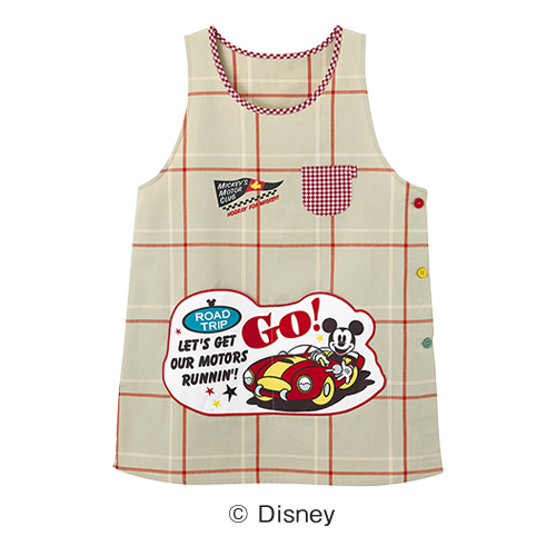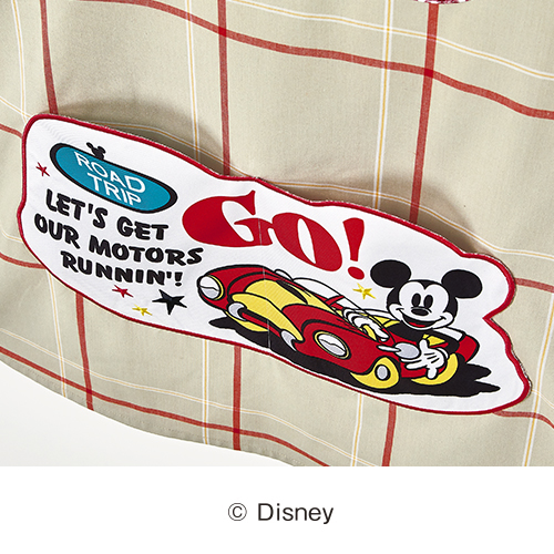 大きなポケットには、ドライブ中のミッキーマウスがプリントされています。グレーと赤のギンガムチェックがかわいい。