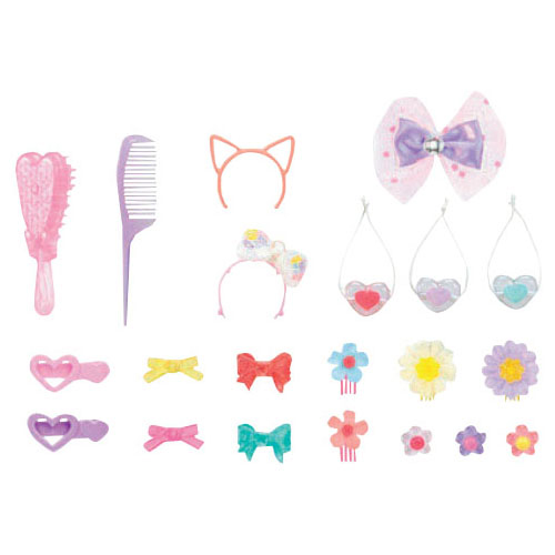 ●内容/人形×1、リボンカチューシャ(ビーズ)×1、リボンカチューシャ(ピンク)×1、ネコみみカチューシャ×1、お花コーム大×2、お花コーム小×2、クリアフラワーコーム×3、クリアリボンコーム大×2、クリアリボンコーム小×2、クリアハートヘアゴム×3、ビッグリボンヘアゴム×1、ヘアクリップ×2、コーム×1、ブラシ×1、クツ×1