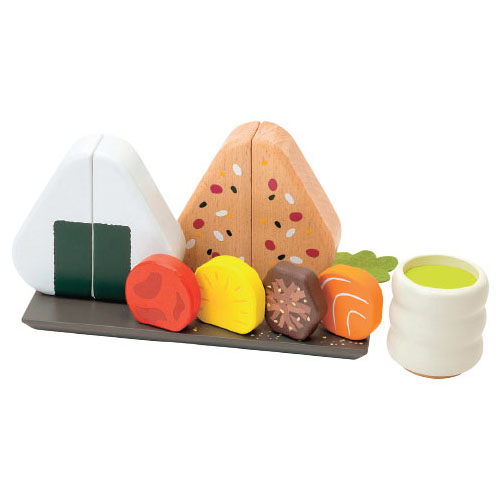 ●内容/おにぎり(白米、雑穀)、おさら、しゃけ、うめ、こんぶ、たくあん、お茶、菜っ葉×各1●サイズ/おにぎり:4.7×4.7×3.1㎝●重量/320g●材質/天然木、MDF(繊維板)、マグネット、ポリエステル