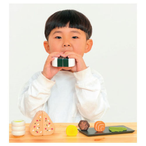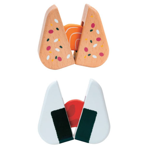 埋め込み式のマグネットでくっつく!おにぎりが握れます。具材を入れ替えて遊ぶことができます。