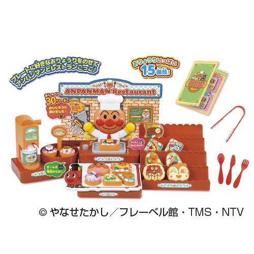 ●内容/本体、棚1、棚2、台、回転パネル、デザート&ドリンクバー、アンパンマンレリーフ、背面パネル、SLマンプレート、シール、トング、ナイフ、フォーク、スプーン、メニュー表、コップ、メロンソーダ、クリーム、チキンライス、パンケーキ、ミートソーススパゲティ、オムライス、チーズハンバーグ、ステーキ、すし、ハンバーガー、ピザ、サラダ、チキン、フルーツ、カップケーキ、プリン、アイス×各1