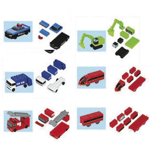 ●内容/パトロールカー(5パーツ)、清掃車(5パーツ)、はしご消防車(5パーツ)、ショベルカー(7パーツ)、レッドストリーム先頭車両(6パーツ)、レッドストリーム中間車両(7パーツ)、組立ガイド(プレイマップ)×各1●サイズ/W324×D70×H250㎜●重量/600g●材質/ABS、PP、MABS、PC