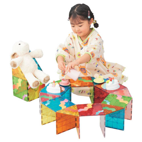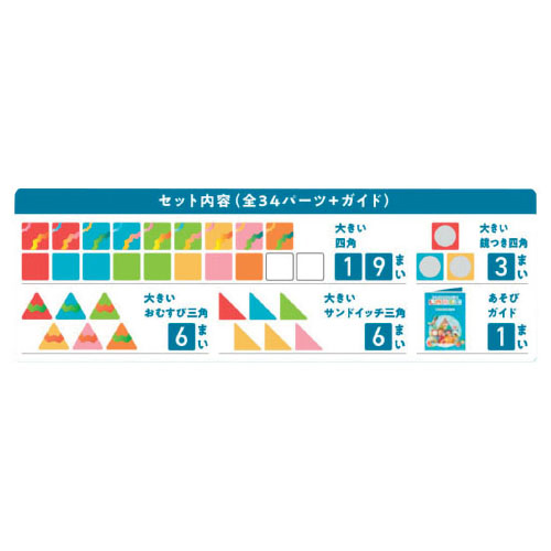 ●内容/全34パーツ(四角×19、鏡つき四角×3、おむすび三角×6、サンドイッチ三角×6)、あそびガイド●サイズ/パッケージ:40×13×30㎝●重量/3200g●材質/MABS、磁石(内蔵式)、PET、紙