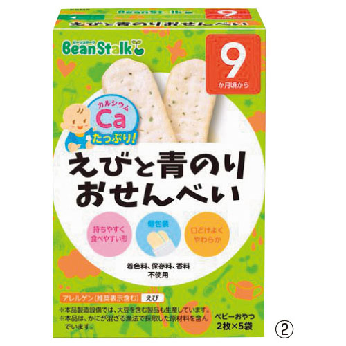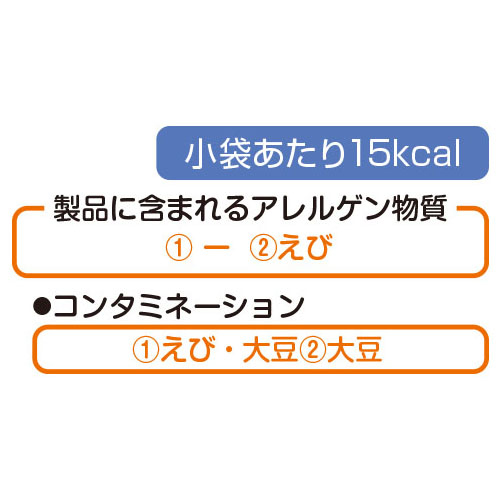 (2)●原材料/米(国産)、でん粉、砂糖、えび粉末、食塩、青のり/炭酸カルシウム