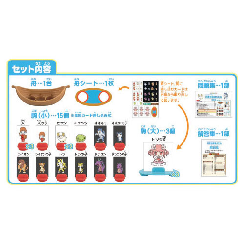 ●内容/舟1台、駒台小15個、駒台大3個、駒カード小15枚、駒カード大3枚、舟シート1枚、問題集1冊、解答集1冊●サイズ/パッケージ:320×230×50mm●重量/約450g●材質/PP、紙
