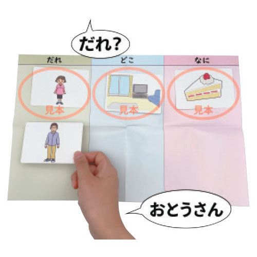 ●内容/場面カード:32枚、だれカード:7枚、どこカード:13枚、なにカード:32枚、白カード:4枚、だれ・どこ・なにシート:1枚、説明書●サイズ/W120×D40×H180㎜●材質/紙